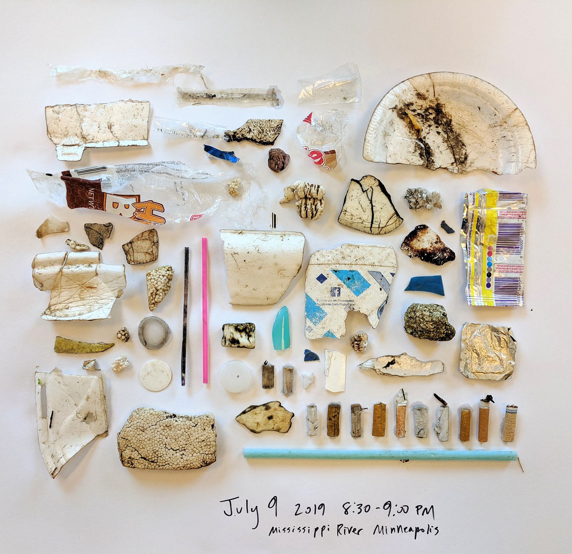 I sit on a floating dock in the Mississippi River and grab all the plastic within arms reach that floats by in 30 minutes. The amount of plastic varies greatly depending on recent rainfall.